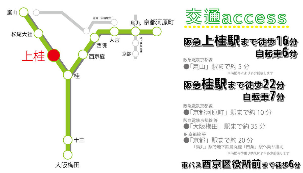 阪急嵐山線「上桂」駅 徒歩16分 阪急京都本線「桂」駅 徒歩22分 バス 徒歩8分 市バス「千代原口」停 徒歩8分 |