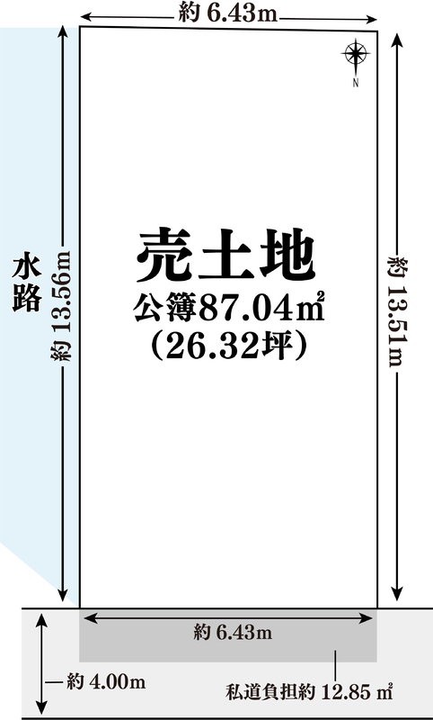 | 駐車場 | - | 道路の幅員 | 北側(私道)幅:4m 間口:6.43m/東側(公道)幅:4m 間口:13.56m |