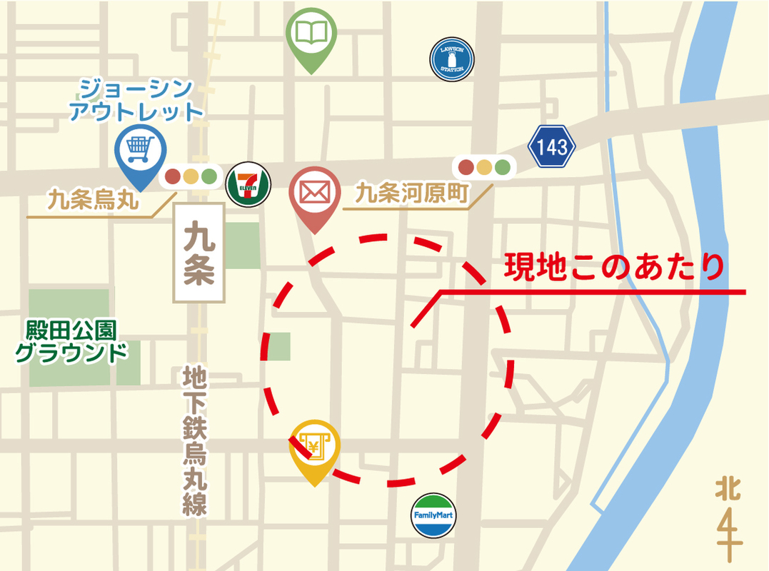 京都市営烏丸線「九条」駅 徒歩8分 JR東海道・山陽本線「京都」駅 徒歩13分 |