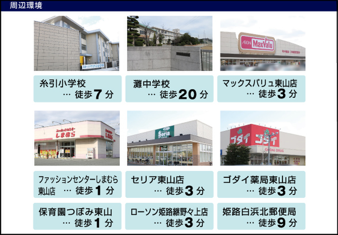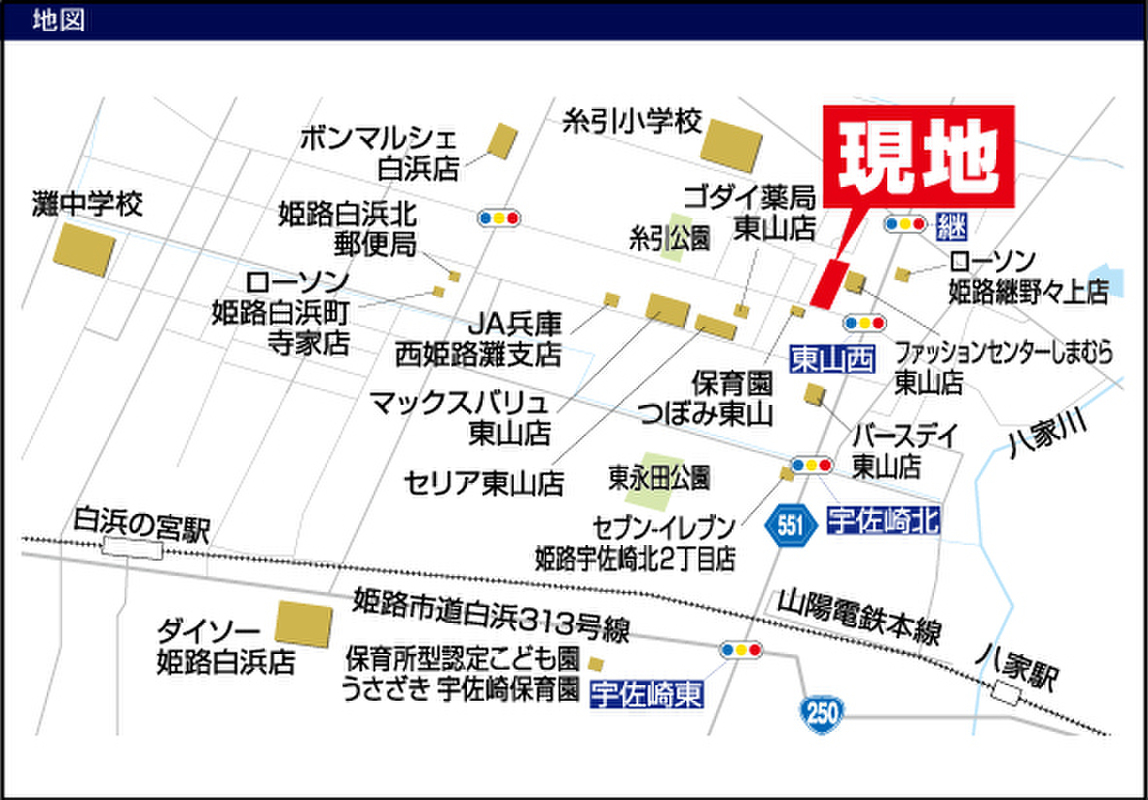 山陽電鉄本線「八家」駅 徒歩13分~14分 JR山陽本線「姫路」駅 神姫バス「東山」停 バス乗車27分 徒歩2分~3分 |