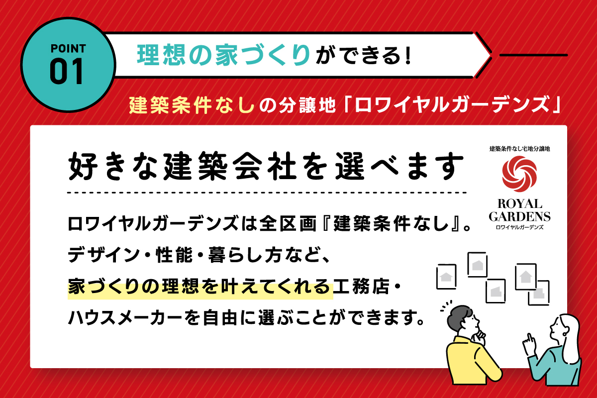 【ロワイヤルガーデンズ(建築条件なし)の特徴】1.理想の住宅ができる 2.正しい依頼先選びができる 3.赤鹿地所売主で手数料なし!お好きなハウスメーカーで建てられます!