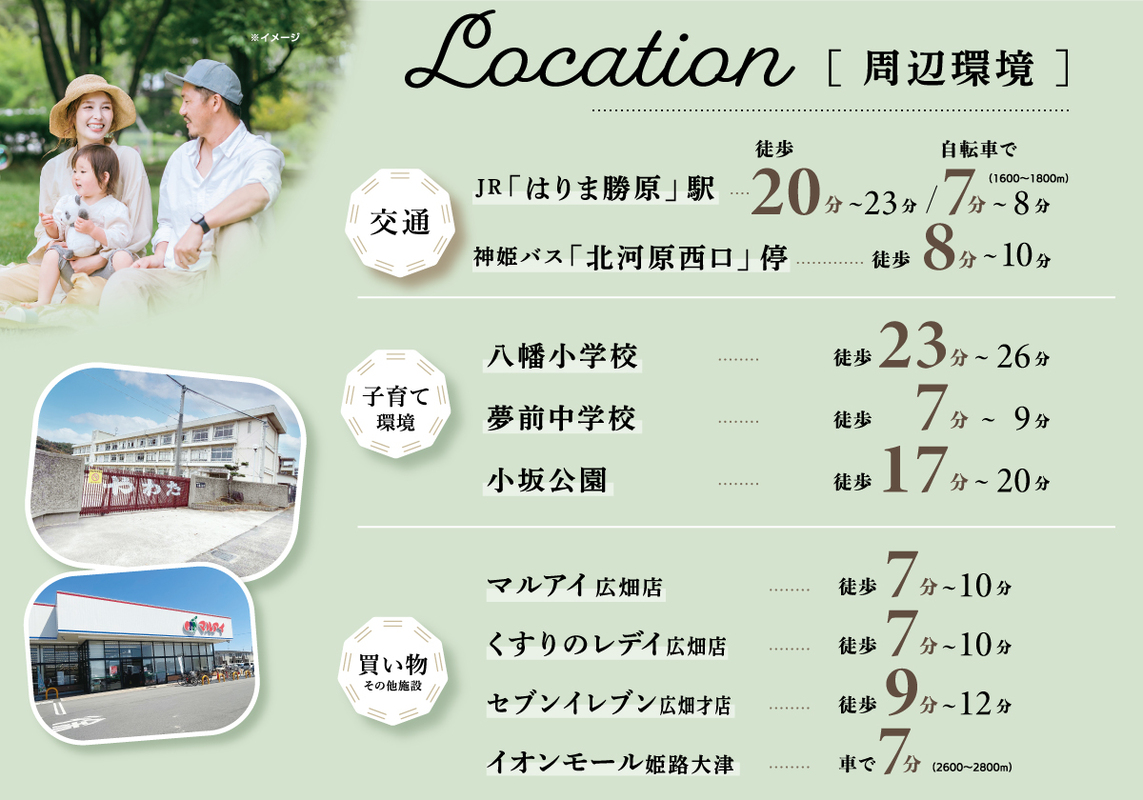 JR東海道・山陽本線「はりま勝原」駅 徒歩20分~22分 JR山陽本線「姫路」駅 北河原西口 徒歩8分~10分 JR山陽本線「英賀保」駅 徒歩23分~25分 |