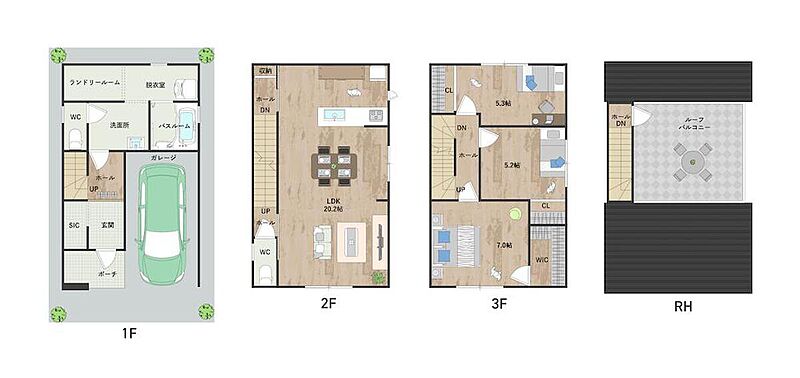 2階LDKは20帖超◎1階にはランドリールームと脱衣室を備えたサニタリーを配置。室内干しや家事室など、多彩に活用可能です。《建物面積107.11m2、建物価格1830万円》