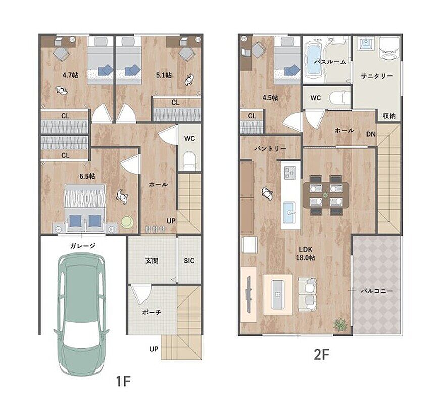 おうち時間がますます充実するルーフバルコニー付きプラン。2階の洋室は約5.5~7.5帖とゆとりがあり、それぞれに収納を設けました。《建物面積109.35m2、建物価格1868万円》