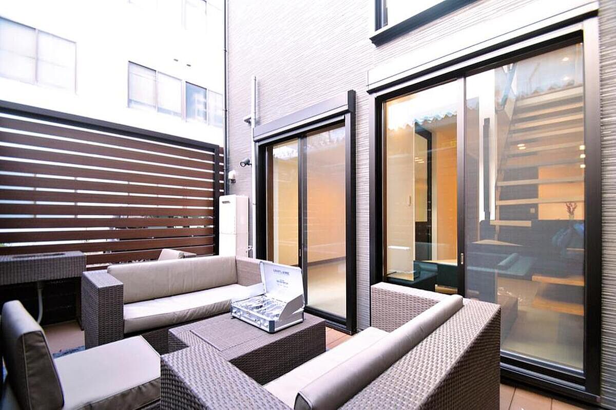 プライバシーを確保したアウトドアリビングを設けました。外で食事...
