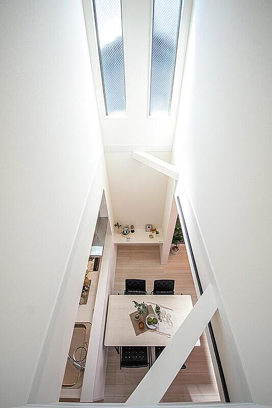 吹抜には大きな2連のスリット窓を設けました。ご家族が集うダイニングに、あたたかい光が注ぎ込む住まいです。