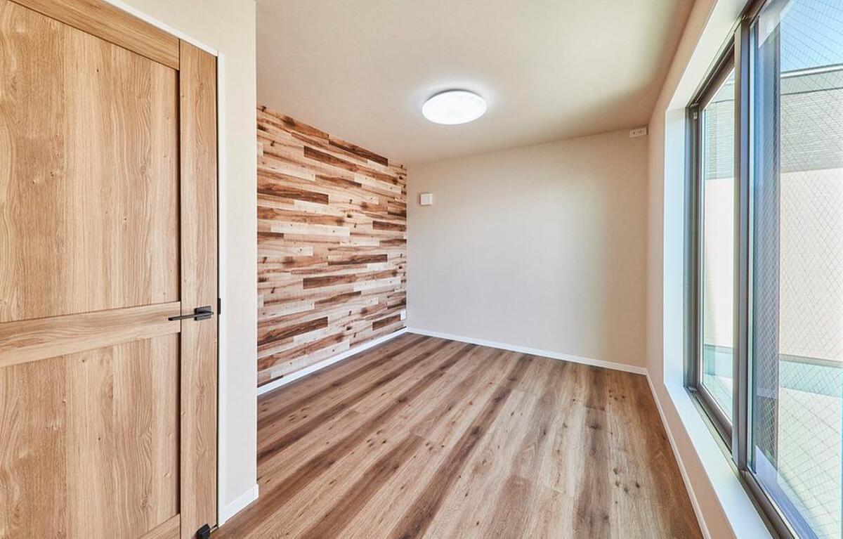 木目柄のアクセントクロスを採用した洋室です。やさしい木の温もりを感じられ、落ち着ける空間を演出します。