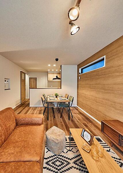 OSB合板のような素朴な壁でアウトドア感を演出。可動棚に加え、...