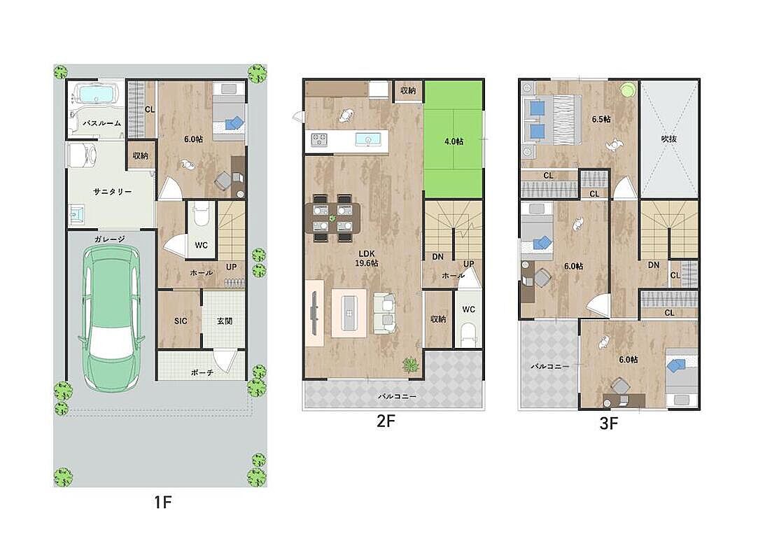 インナーガレージ付き3階建プラン。LDKが南向きバルコニーに面...