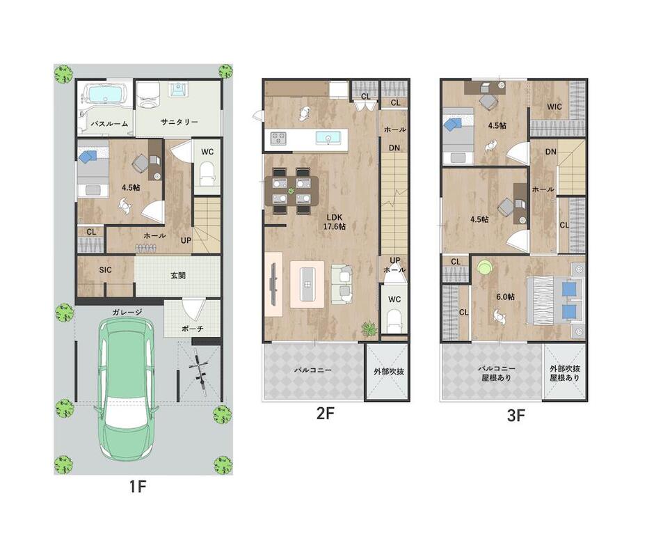 インナーガレージ付き3階建プラン。LDKが南向きバルコニーに面する陽当りの良い住まいです。《建物面積123.12m2、建物価格2212万円》