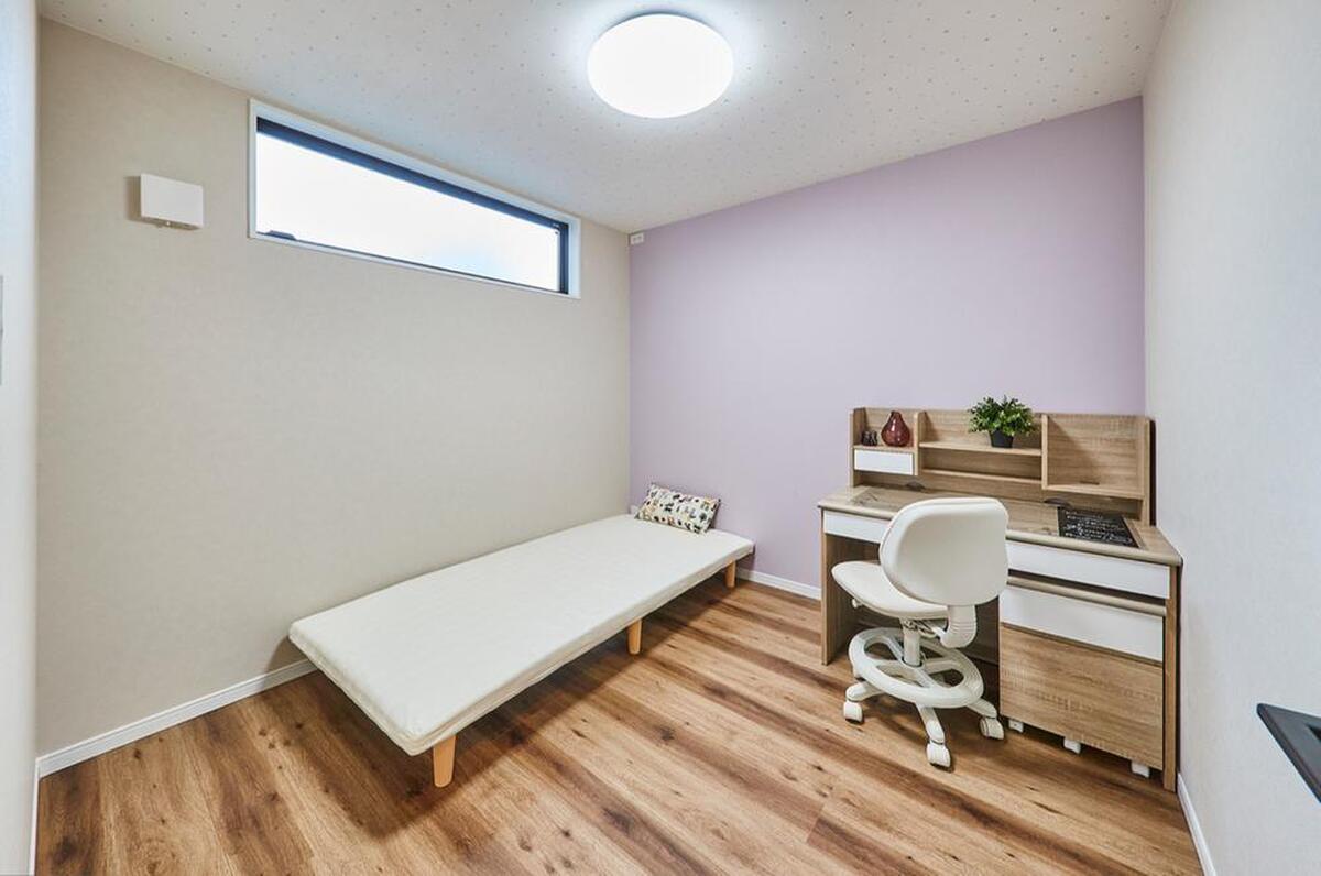 ラベンダー色を取り入れ、フェミニンな空間に仕上げた洋室です。天...