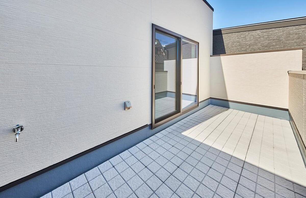 広めに設計したバルコニーにはコンセントや水栓も設置済み。両サイドの壁を高くすることで、プライバシーが保たれます。