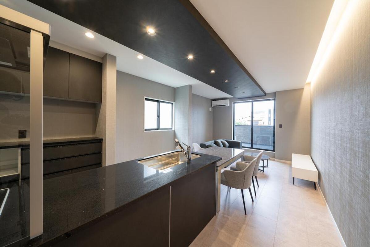 1.黒を基調としたフラットな仕様のカウンターで、スタイリッシュな印象に。機能性と洗練されたデザインを兼ね備えました。《分譲地外:建物面積89.10m2、建物価格1662万円》