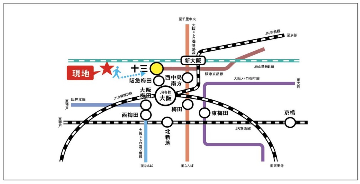阪急神戸本線「十三」駅 徒歩10分 阪急宝塚本線「大阪梅田」駅 大阪シティバス12分「田川通」バス停 徒歩2分 JR大阪環状線「大阪」駅 大阪シティバス12分「田川通」バス停 徒歩2分 |