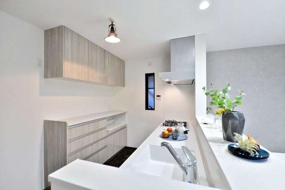 2.キッチン前面の視界が広がりリビングを広く感じるよう、吊り戸棚とカップボードをキッチンの背面に設けています。《分譲地外:建物面積101.25m2、建物価格1818万円》