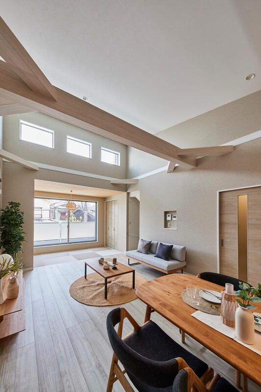 伸びやかに視線が広がる勾配天井を設けたLDK。窓から陽光がたっぷりと注ぐ、自然の恩恵に満ちた空間。《分譲地外:建物面積93.95m2、建物価格1691万円》