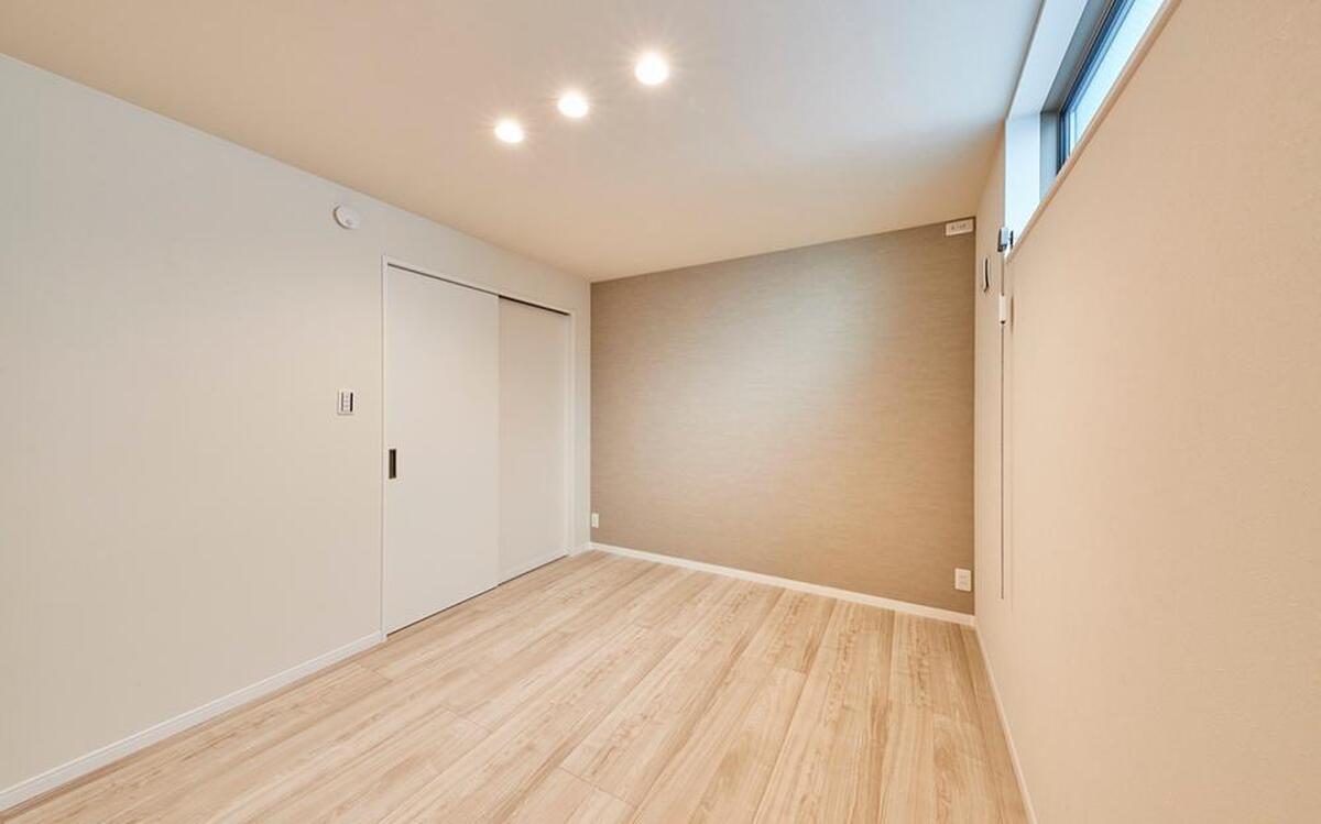 ニュートラルカラーでまとめた洋室には、塗り壁風の壁紙と木目が映える床材を採用し、素材感をプラスしました。《分譲地外:建物面積93.95m2、建物価格1691万円》