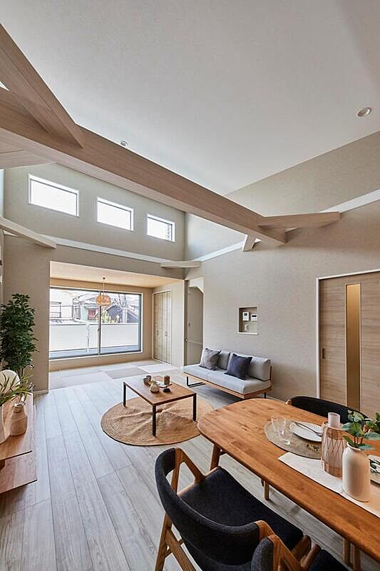 梁の存在感と高窓が映える2階LDK。天井の木目デザインが、空間...