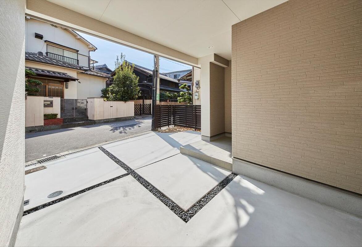 インナーガレージには砂利の目地を施し、意匠性を高めました。ベージュの外壁材が良いアクセントになっています。《分譲地外:建物面積93.95m2、建物価格1691万円》