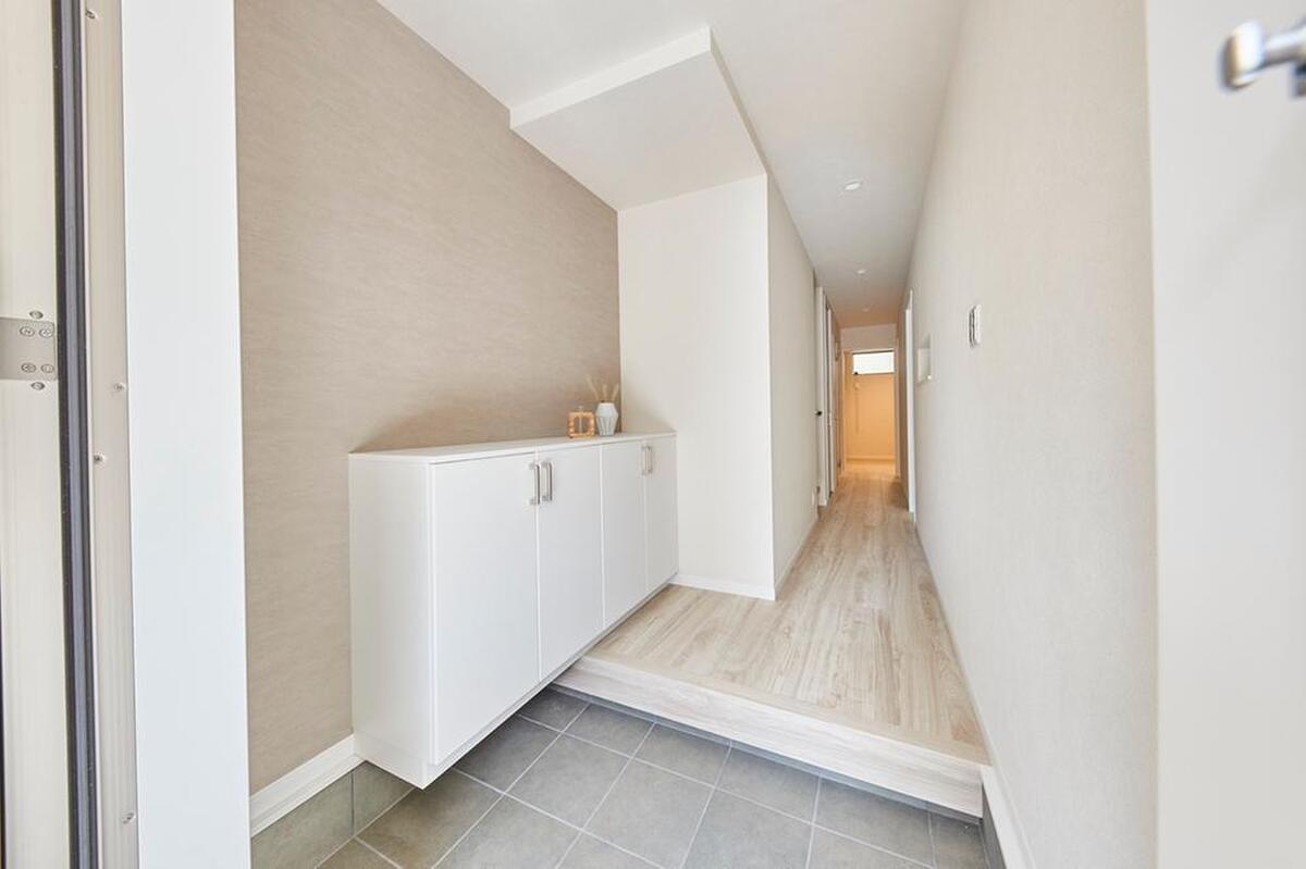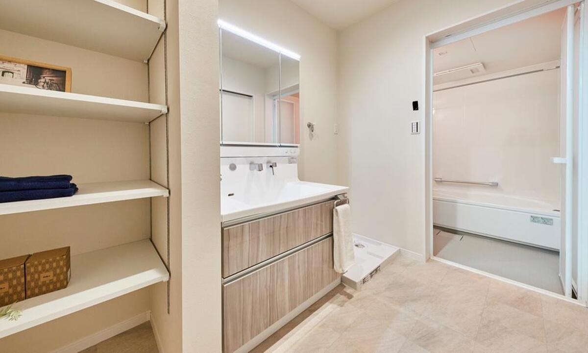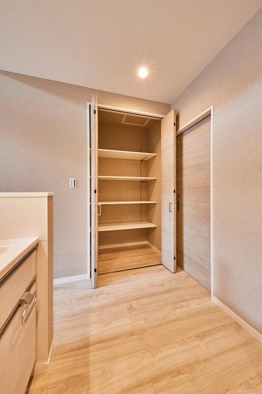 ホワイトナチュラル系のカラーに、木目をプラスして柔らかい印象に。リネン庫として使える可動棚有り。《分譲地外:建物面積93.95m2、建物価格1691万円》