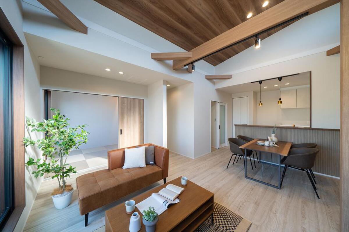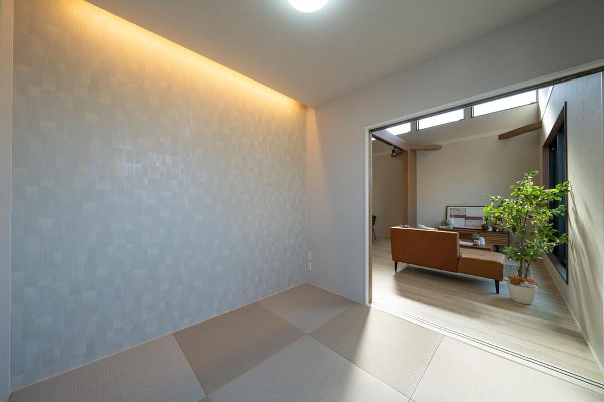 くすみカラーの琉球風畳に、木を編んだようなデザインの天井を組み合わせ、和のエッセンスを盛り込みました。《分譲地外:建物面積93.95m2、建物価格1691万円》