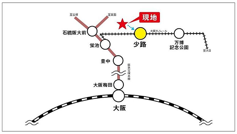 大阪モノレール本線「少路」駅 徒歩13分~14分 北大阪急行電鉄「千里中央」駅 阪急バス13分「少路二丁目」停 徒歩9分~10分 阪急宝塚本線「豊中」駅 阪急バス12分「宮山」停 徒歩4分~5分 |