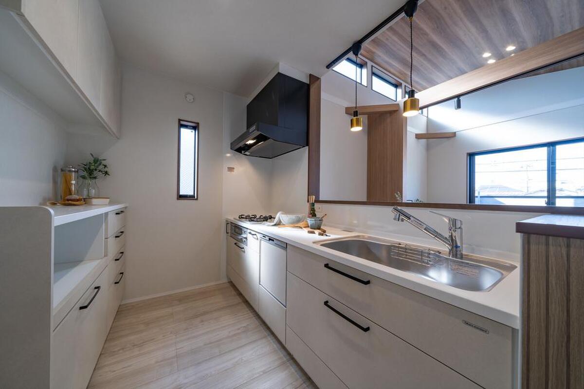キッチンはカップボードを置ける広さを確保。爽やかに差し込む自然...