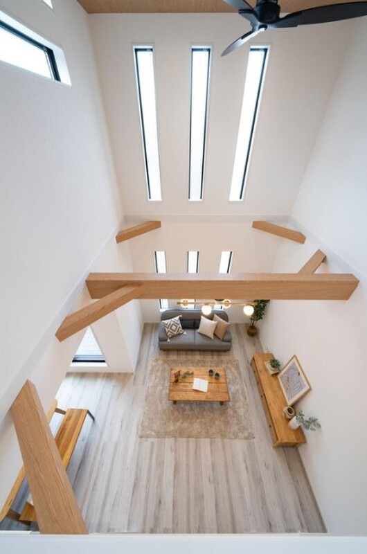 吹抜けを採用した開放感溢れるLDK。高窓からたっぷりと自然光が...