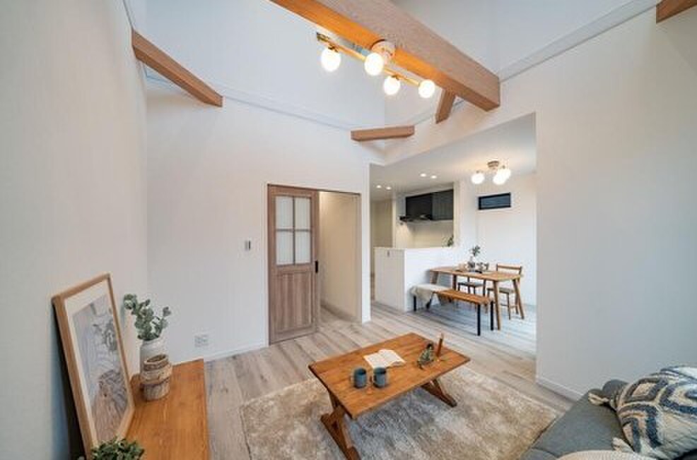 リビングとダイニングをゾーニングしており、空間の使い分けがスムーズです。木目の見せ梁が空間のアクセントに◎《分譲地外:建物面積103.67m2、建物価格1862万円》
