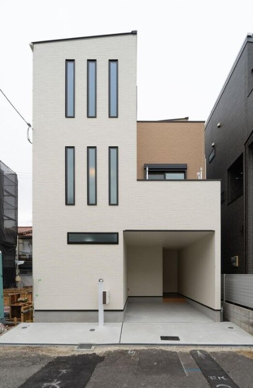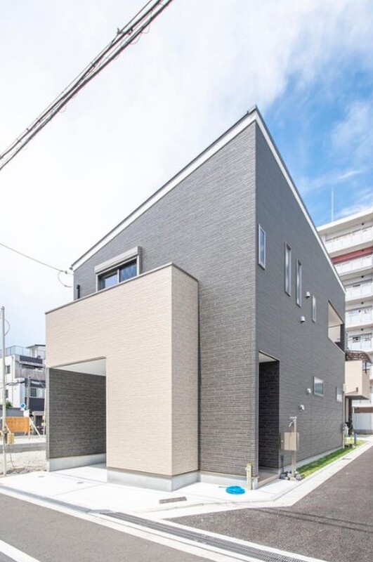 グレーとホワイトのコントラストが洗練された印象を与える外観。プライバシーを考慮した窓配置です。《分譲地外:建物面積103.07m2、建物価格1851万円》