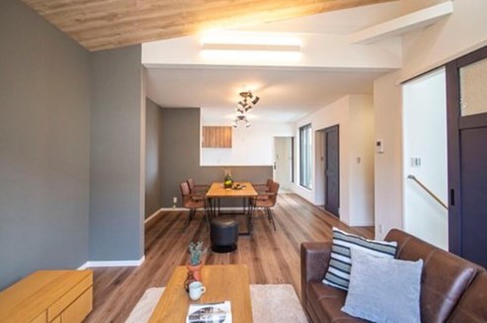 2面採光で心地よい光と風が抜けるLDKは、照明も効果的に設置し、落ち着いた雰囲気を演出しています。《分譲地外:建物面積103.07m2、建物価格1851万円》
