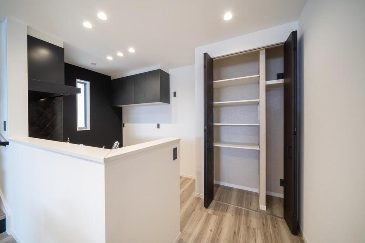 食材のストックの保管に役立つパントリー。コンセント付きの縦長の...
