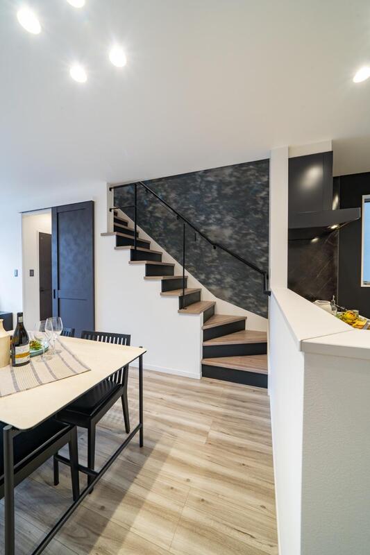 インテリアは白と黒の素材をバランスよく配置し、家全体をモノトー...