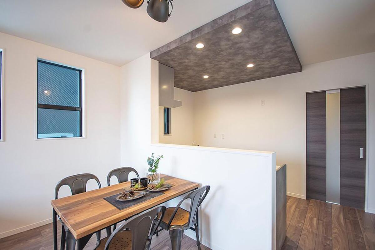 キッチン上部に、空間に奥行きをもたらす折下天井を採用しました。質感のあるクロスを使用し、高級感を演出しています。《分譲地外:建物面積95.78m2、建物価格1720万円》