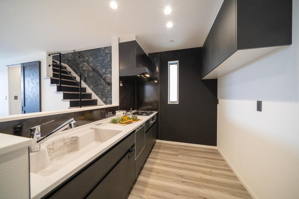 キッチンは黒をメインカラーに統一。模様のついたキッチンパネルが...
