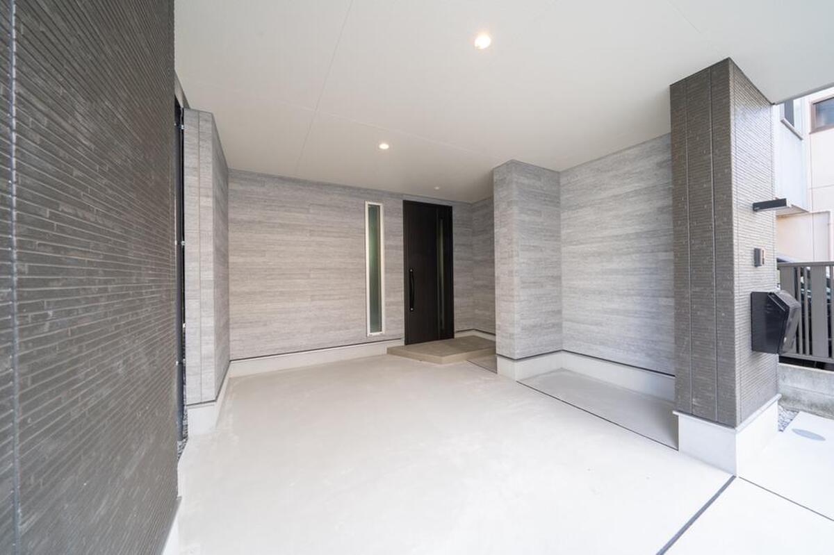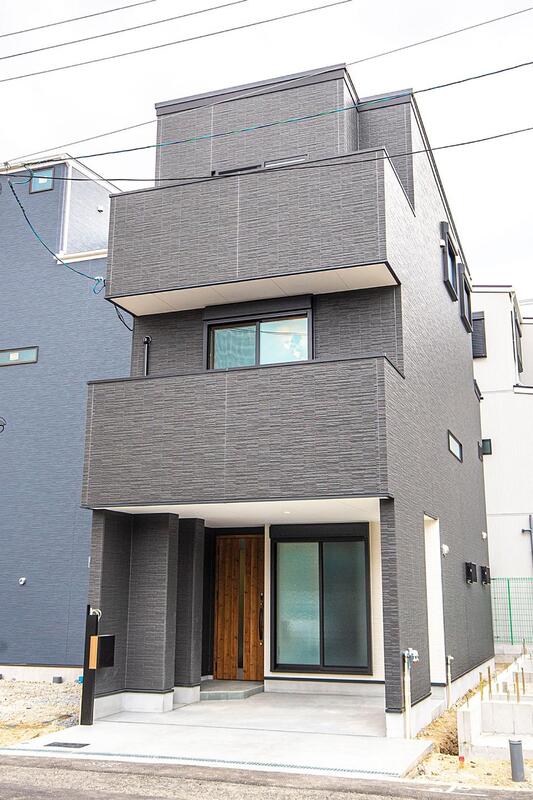 ダークグレーの外壁が重厚感のある佇まい。軒天にはホワイトを使用し、外壁のカラーが際立つようスタイリングしました。《分譲地外:建物面積95.78m2、建物価格1720万円》