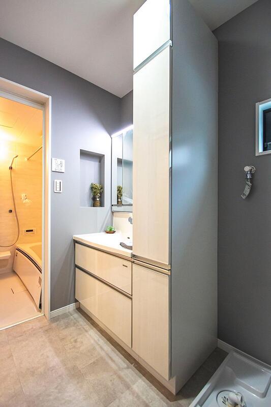 落ち着いたトーンの洗面室は、トールキャビネットを設置しました。...