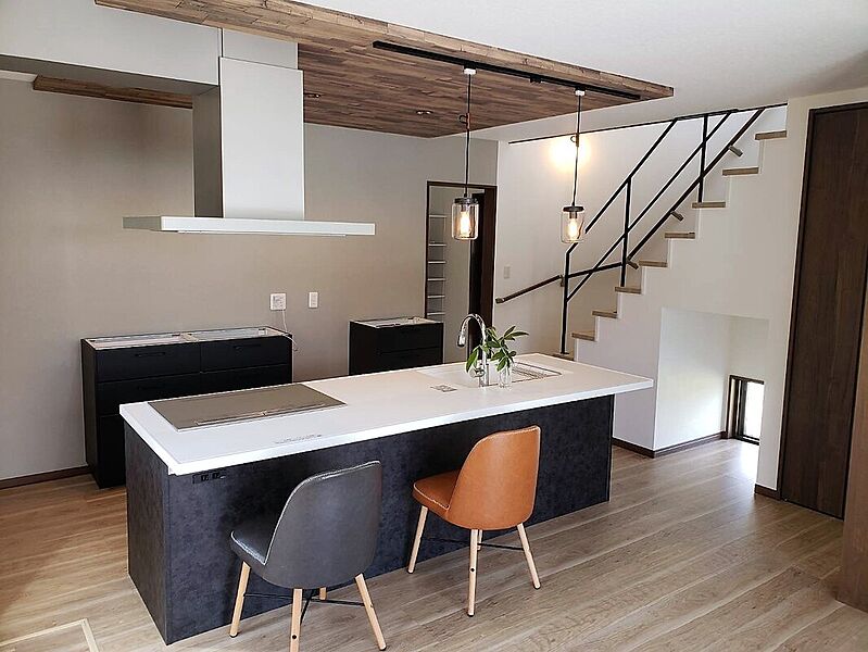 キッチンの腰壁には『モールテックス』を採用し、味のある雰囲気を出しています。また、LDKをメインに壁は自然素材の『漆喰』仕上げを取入れております。