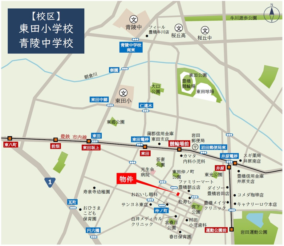 ◇周辺施設 ■交通機関 豊鉄東田本線「競輪場前」駅…約550m(徒歩約7分) ■教育施設 春日保育園…約450m(徒歩約6分) 東田小学校…約1200m(徒歩約15分) 青陵中学校…約2200m(徒歩約28分) ■ショッピング施設 サンヨネ東店…約300m(徒歩約4分) スギ薬局井原南店…約950m(徒歩約12分) ファミリーマート豊橋朝丘店…約120m(徒歩約2分) ■医療施設 光生会病院…約400m(徒歩約5分) おおいし眼科…約180m(徒歩約3分) 白井メディカルクリニック…約300m(徒歩約4分) 村田小児科…約350m(徒歩約5分) ■金融機関 蒲郡信用金庫東田支店…約600m(徒歩約8分) 豊橋信用金庫井原支店…約800m(徒歩約10分) ■公共施設 豊橋岩田郵便局…約500m(徒歩約7分) 宮下公園…約220m(徒歩約3分) 東田仲ノ町公園…約270m(徒歩約4分) お問い合わせ、ご見学をご希望の方はお気軽にご連絡ください (火・水曜日は定休日です) |
