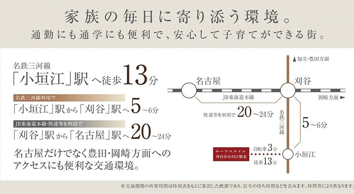 名鉄三河線「小垣江」駅まで徒歩約13分(1,000m)名古屋方面だけでなく豊田・岡崎方面へのアクセスも良好です