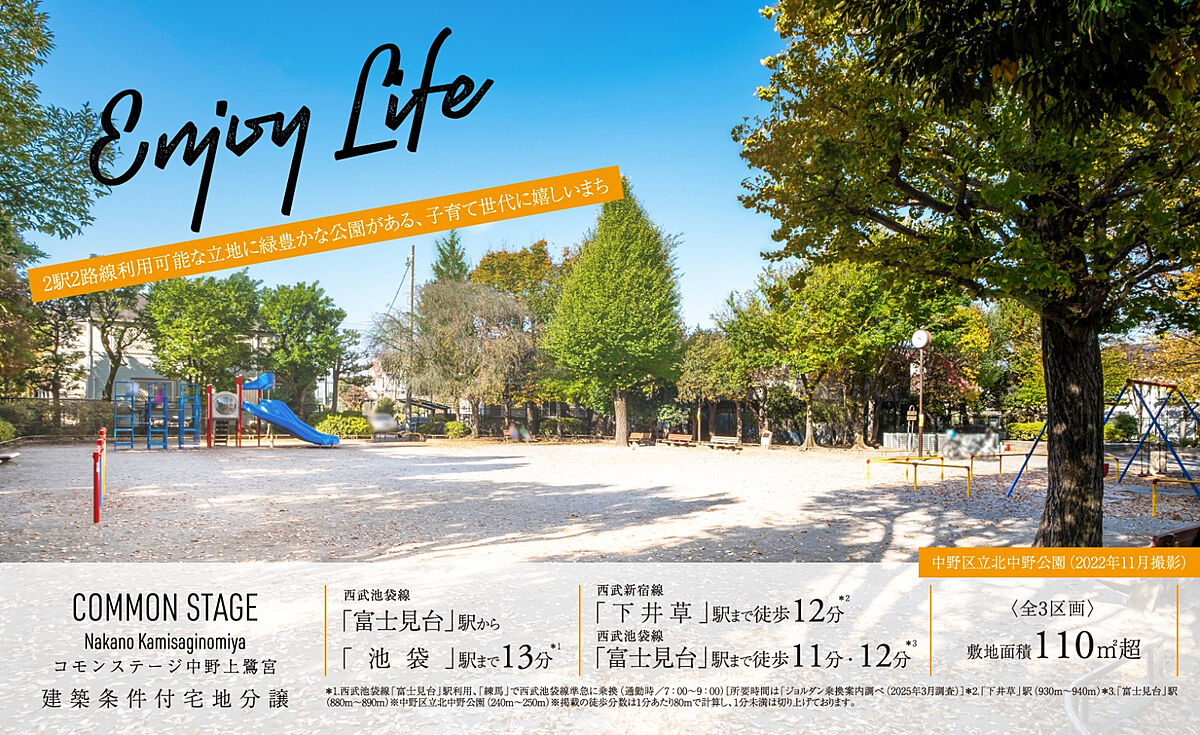 西武池袋線「富士見台」駅へ徒歩11~12分、西武新宿線「下井草」駅へ徒歩12分。2駅2線利用可能な立地です。