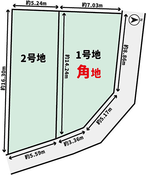 | 駐車場 | 2台 | 道路の幅員 | 北側公道:幅6m 間口8.86m 東側公道:幅6m 間口14.12m |