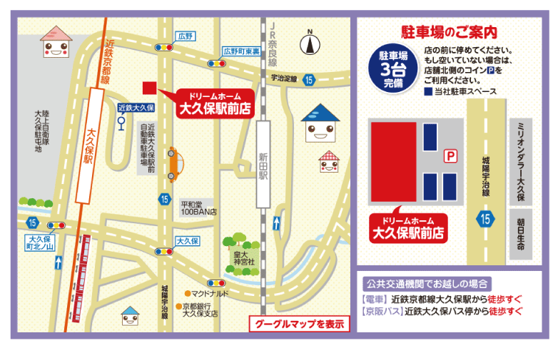 京阪宇治線「三室戸」駅 徒歩20分 京都京阪バス「明星町2丁目」 徒歩4分 |