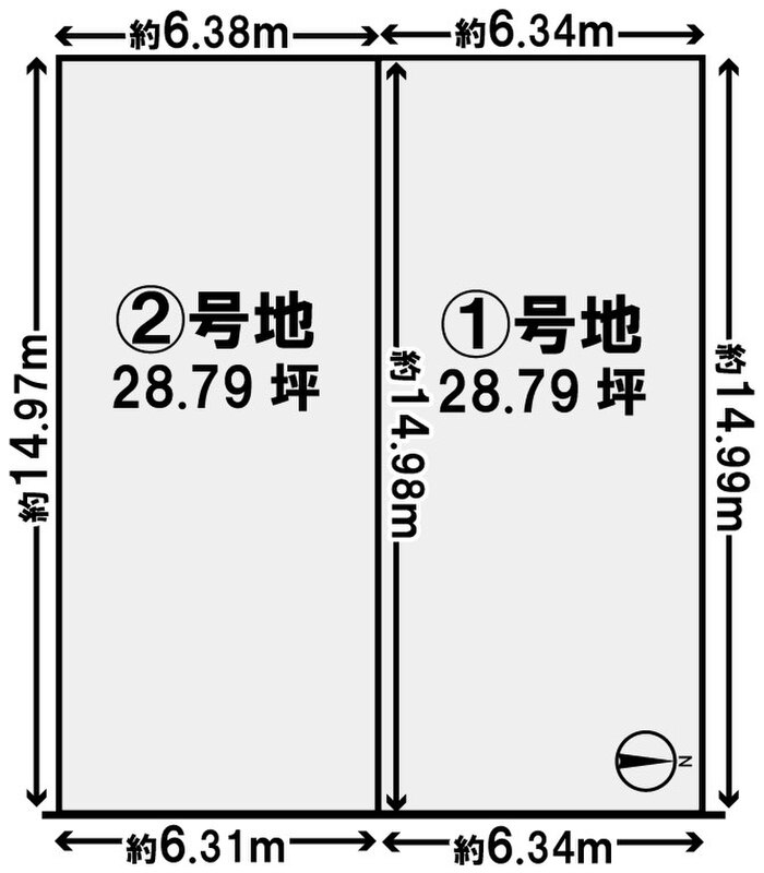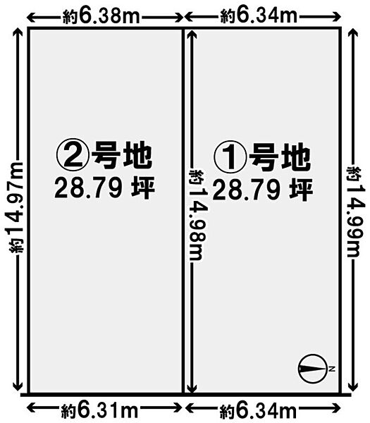 | 駐車場 | 2台 | 道路の幅員 | 東側公道:幅4m 間口6.34m(1号地)・6.31m(2号地) |