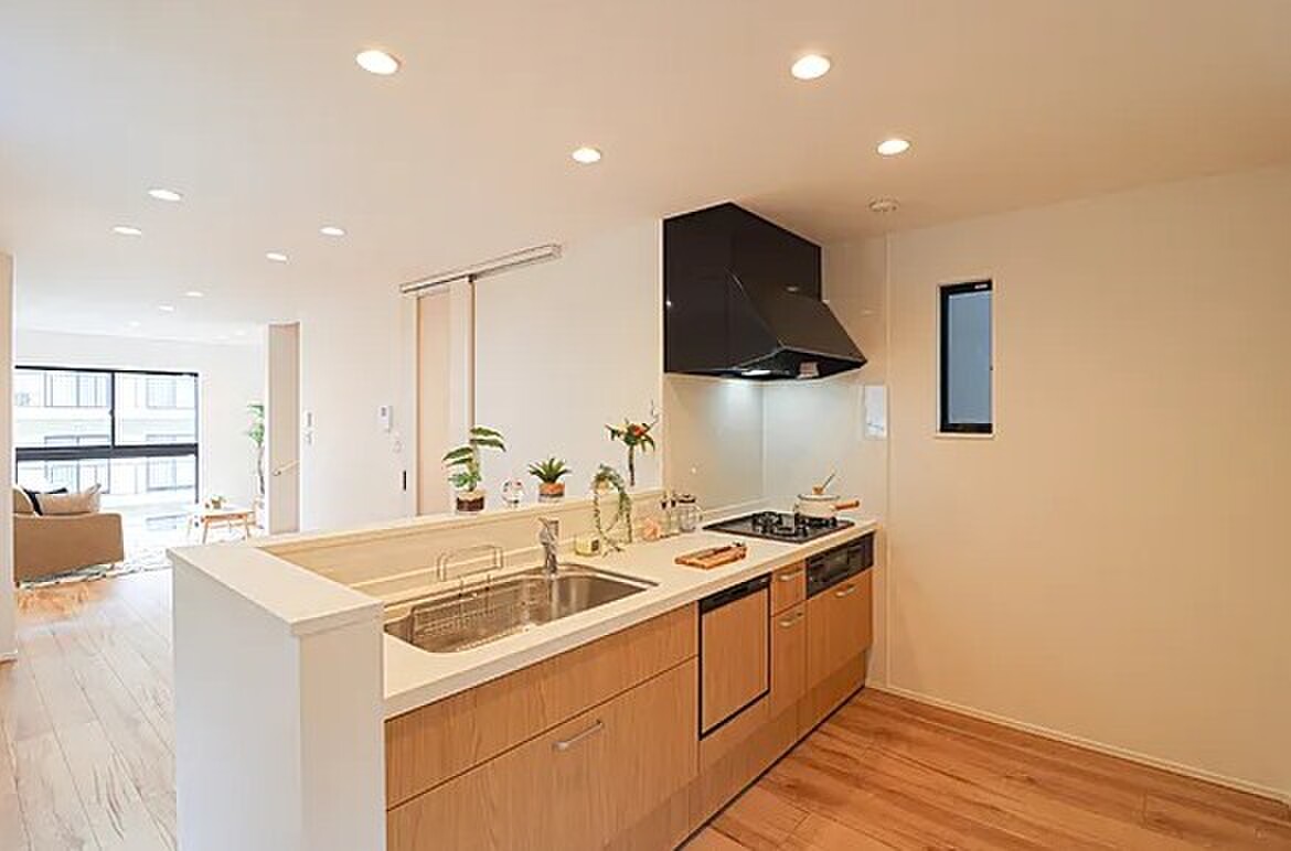 ■対面キッチンは、調理中もリビングやダイニングの家族の様子を確...