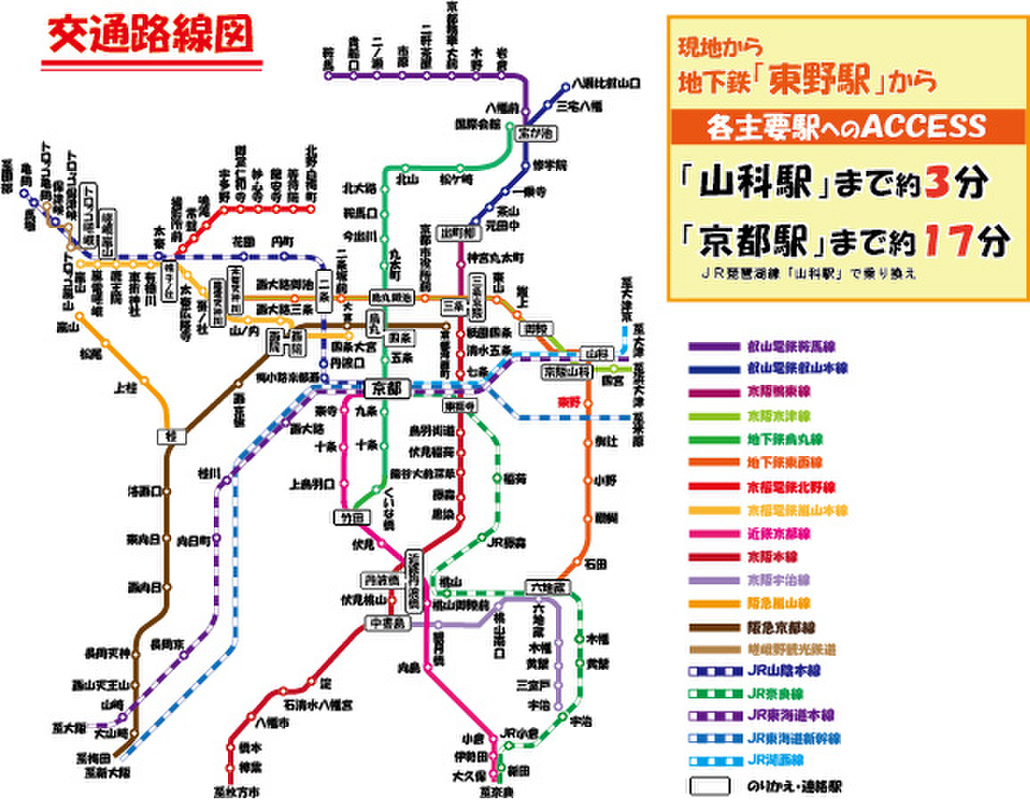 京都地下鉄東西線「東野」駅 徒歩10分 JR東海道・山陽本線「山科」駅 徒歩13分 京阪京津線「京阪山科」駅 市バス「長福寺道」停 徒歩13分 |