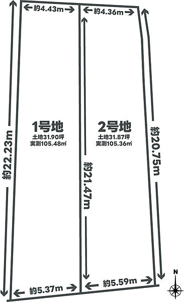 | 建物面積 | - | 土地面積 | 実測105.48m2(31.9坪)・実測105.36m2(31.87坪) |