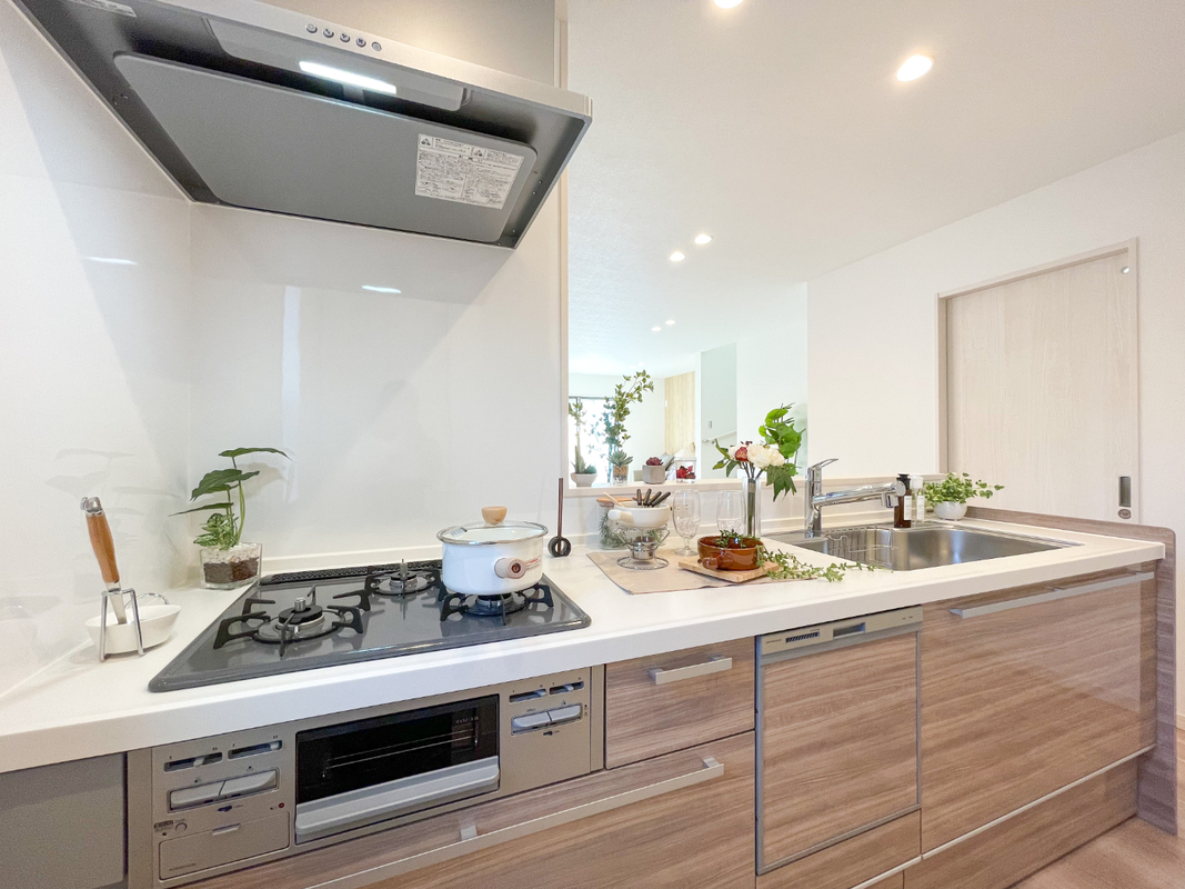 ご飯の準備や後片付けの時短になる食器洗い乾燥機やホーロートップガスコンロ、グリルが備え付け!充実設備で家事の時間が短縮され、家族のくつろぎタイムもゆっくりもてますね♪