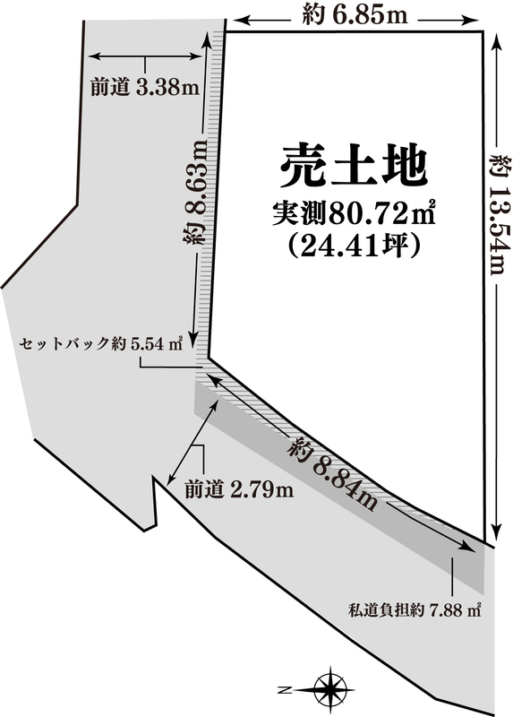 | 駐車場 | - | 道路の幅員 | 北側(私道)幅:3.38m、間口:8.63m 西側(公道及び私道)幅:2.79m、間口:8.84m |