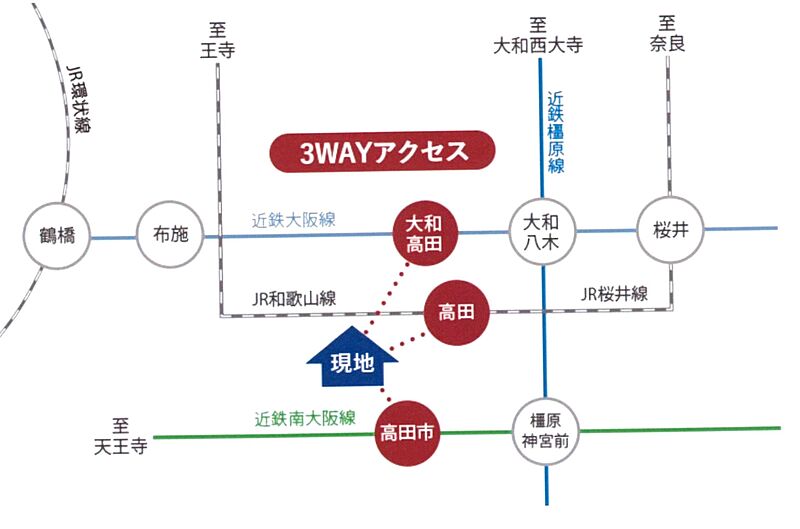 近鉄大阪線「大和高田」駅 徒歩14分 近鉄南大阪線「高田市」駅 徒歩18分 JR和歌山線「高田」駅 徒歩12分 |